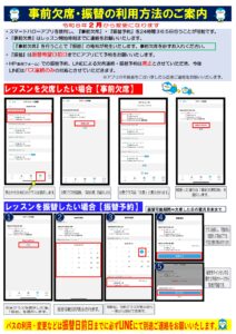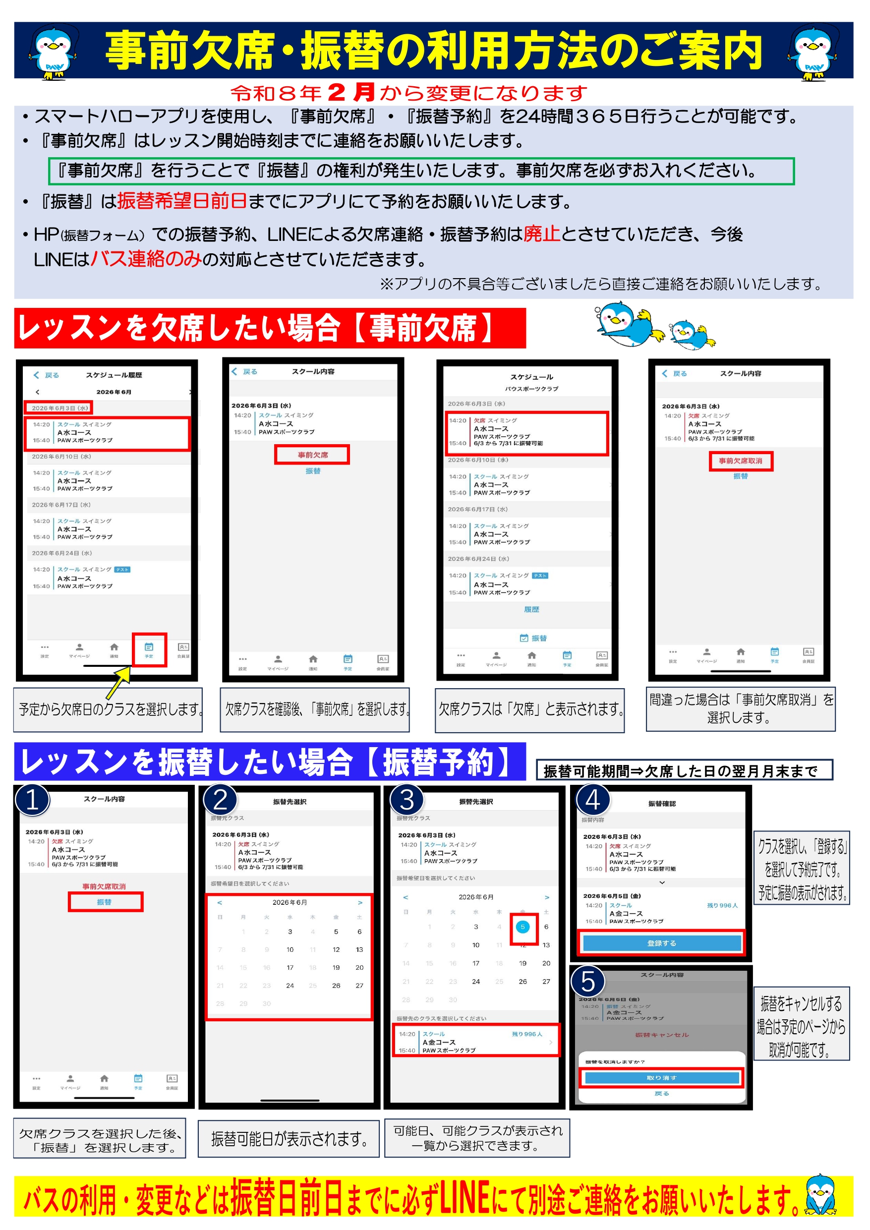 欠席連絡・振替予約について お知らせ,キッズ 2026年1月21日 ジュニア会員の皆様へ 日頃よりご愛顧いただき誠にありがとうございます。 令和8年2月より欠席連絡・振替予約の仕様が変わります。 詳しくは下記をご参考くださいませ。