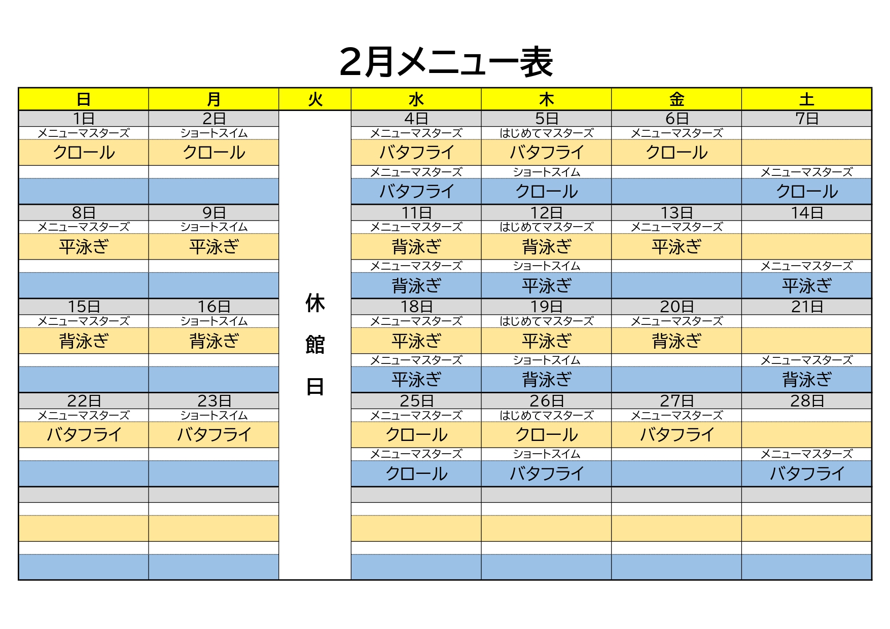 2月プールプログラムのご案内 お知らせ,その他,フィットネス 2026年1月31日 いつもパウスポーツクラブをご利用いただきありあがとうございます。 毎日雪が降り足元も悪く大変ですね・・・ 転倒の恐れもありますので気を付けてご来館ください!! ※2026年のマスターズ登録の受付を開始します。 2月上旬から下旬までの受付期間となりますので、 館内の掲示をご確認いただき ご希望の方は期間内にフロントにて手続きをお願いいたします