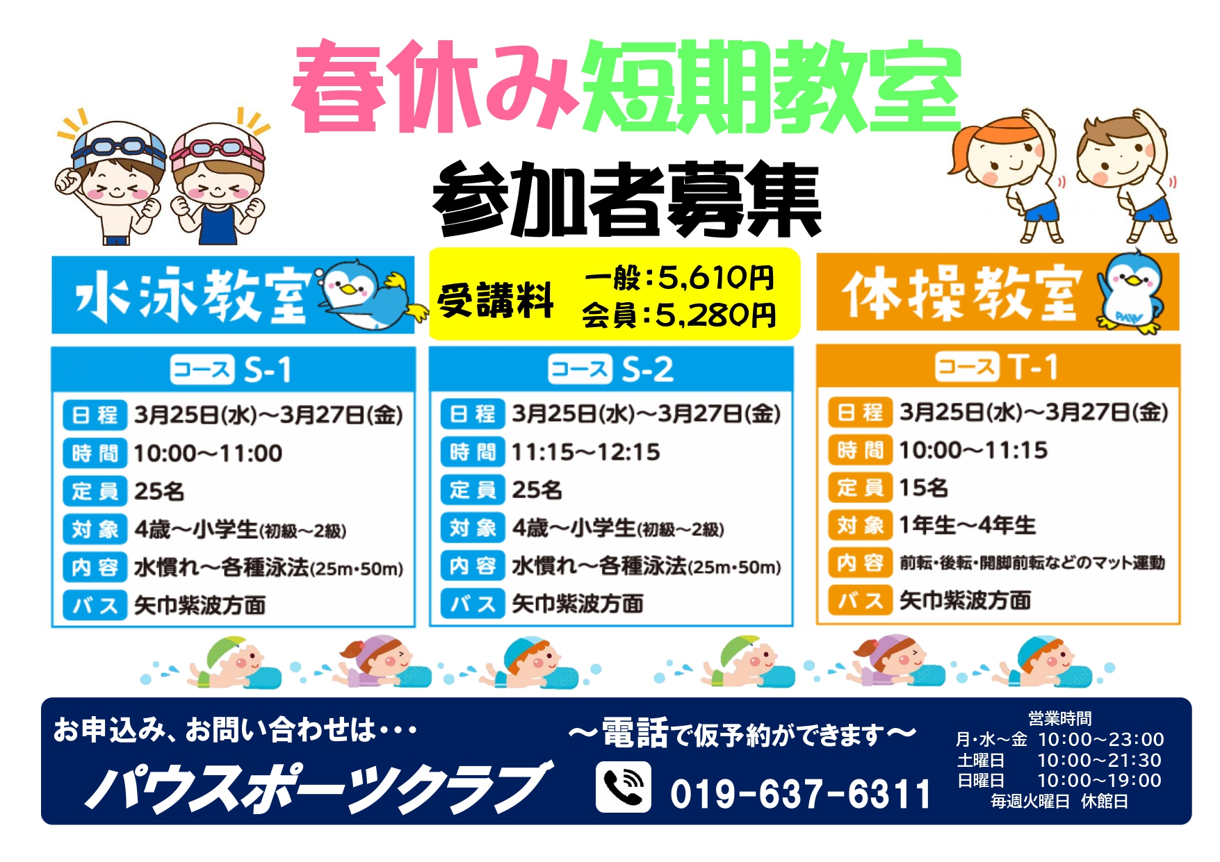 春休み短期教室のご案内 お知らせ,キッズ 2026年3月4日 いつもパウスポーツクラブをご利用いただきありがとうございます。 春休み短期教室を実施いたします。 水泳・体操ともに3日間コースを行います。 習い事が初めてのお子様にも参加しやすい日数ですので この機会にぜひ挑戦してみませんか? 皆様のご参加をお待ちいたしております!